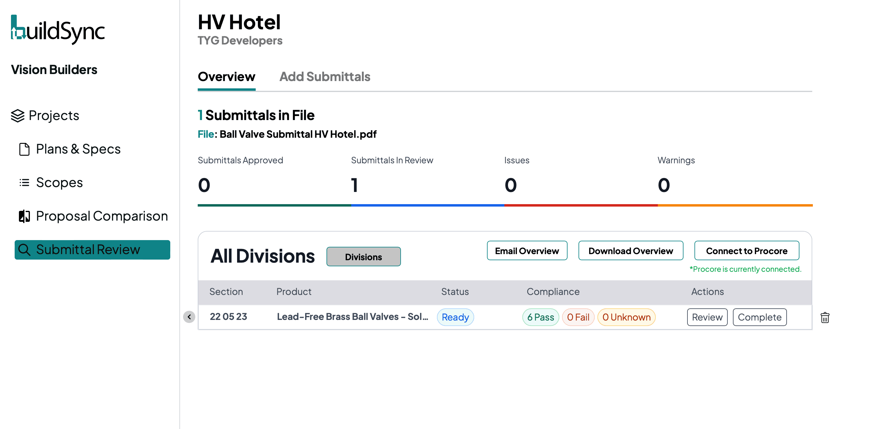 BuildSync verifies if product data and material samples comply with your contract documents. Every technical detail is checked against project requirements, performing the proper review your team needs before the design teams review.