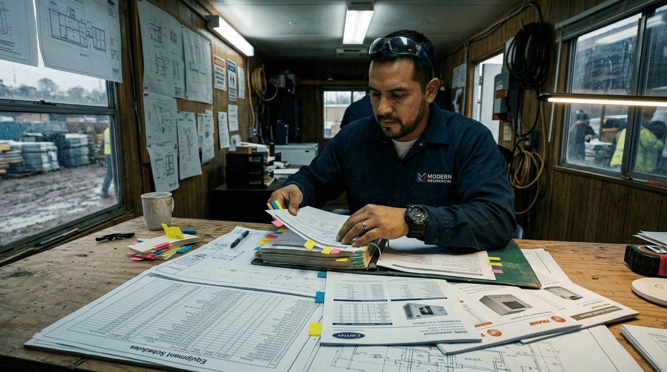 High-complexity | AHUs, chillers, custom switchgear, rooftop units, audiovisual systems | 4 - 8+ hrs | 60+ characteristics per submittal. Shop drawings for custom items require careful review against contract documents. Critical path items carry the highest cost of error. |