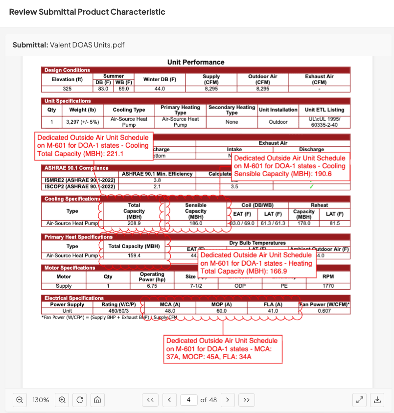 Here's where AI differs from workflow automation: you can verify every finding. Click on any characteristic, and the AI shows you the original construction documents - both the submittal and project specifications - with relevant text highlighted. No hunting through 70 pages to find where that refrigerant type was listed.