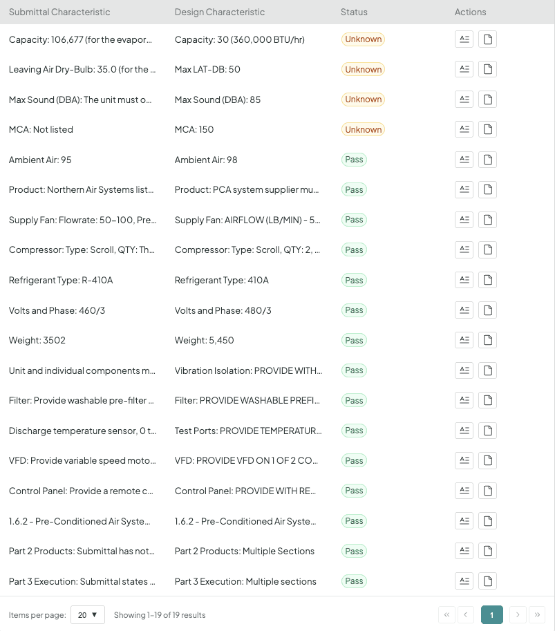 Submitting product data alone is not the same as submitting a compliant HVAC submittal. The reviewer's job is to verify that the submitted equipment meets every technical requirement in the spec. On a single piece of HVAC equipment, that can mean checking 30 or more individual characteristics across performance data, electrical data, and physical specifications.
