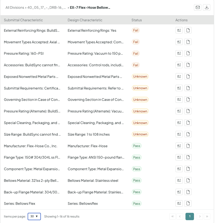Every characteristic gets a clear pass, fail, or unknown status, so every stakeholder knows exactly what needs to be resolved before the submittal goes out for approval.