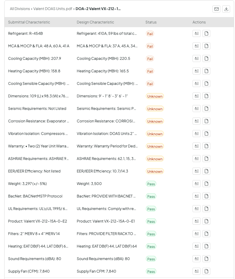 This is exactly where BuildSync transforms the review process. Instead of project managers spending hours extracting data points manually, BuildSync automatically identifies every technical characteristic, compares it against your specifications, and flags passes, fails, and unknowns across all submittal types - from HVAC equipment to fire protection systems.