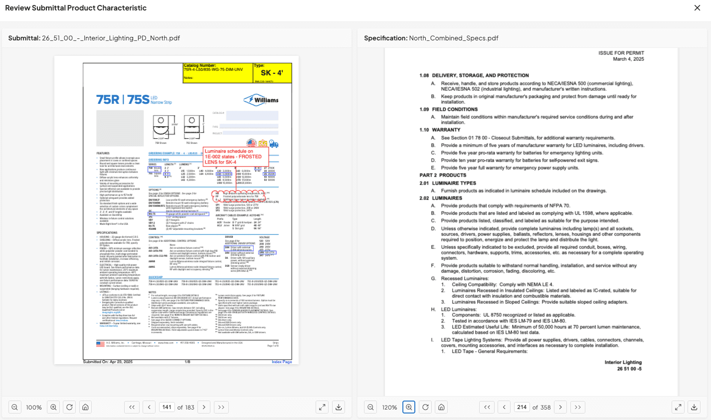The challenge: Manually reviewing hundreds of submittals across all these categories is where most teams struggle. Each submittal contains dozens of technical characteristics that must be verified against specifications. Miss one requirement in a 70-page equipment submittal, and you're facing rejection and resubmission.